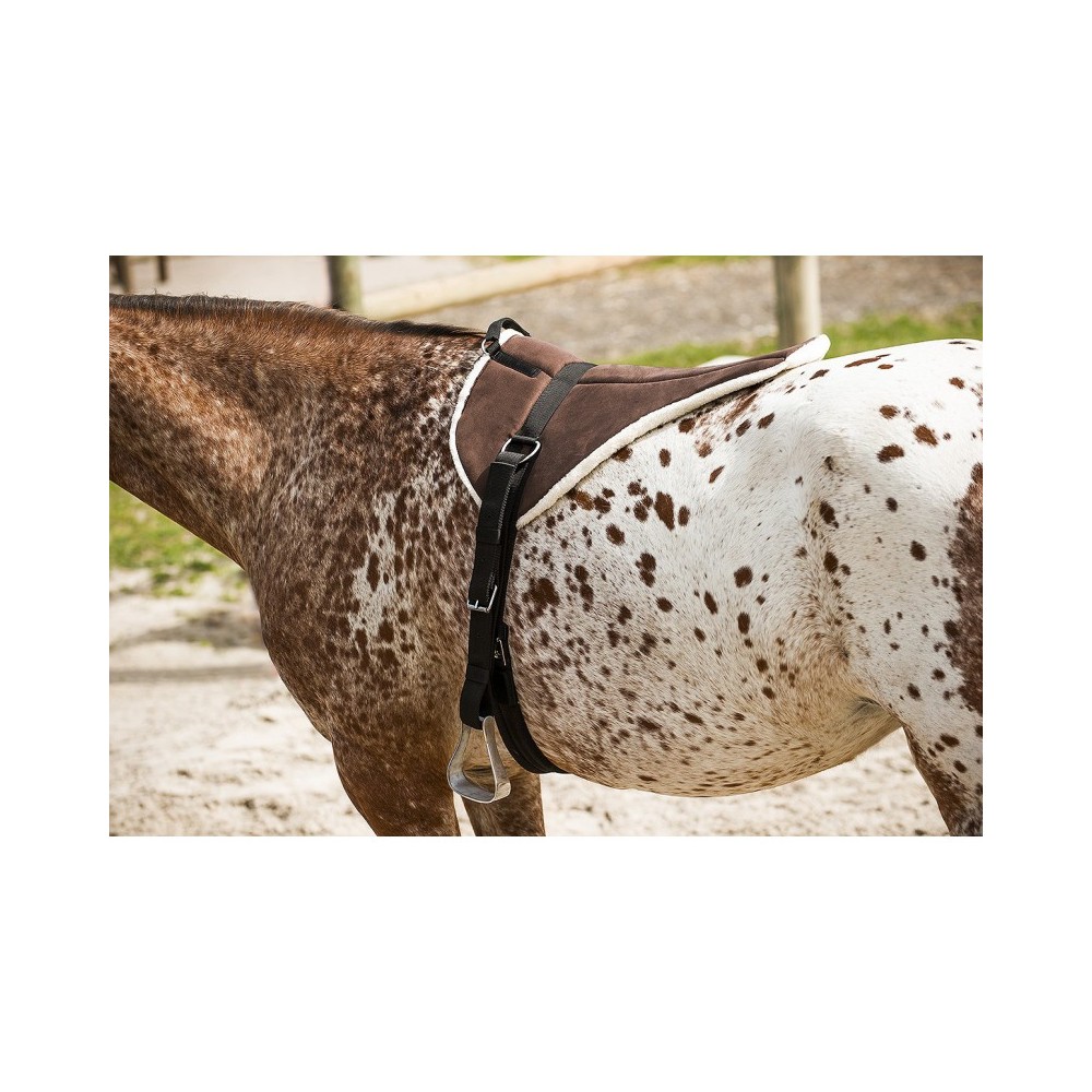 Un tapis doux et moelleux, pour votre confort et celui de votre monture ! Polyester doux façon alcantara avec matelassage mousse 25 mm et doublure en mouton synthétique. Equipé d’étrivières réglables montées sur anneaux fixés de part et d’autre d’un sanglon de renfort, et d’une poignée de maintien en polypropylène. Etriers type western en zinc. Sanglage long par contre-sanglons en polypropylène et sangle courte coton matelassé, longueur 70 cm. Bouclerie en métal chromé. Livré dans un sac de transport zippé. Paré pour la promenade !