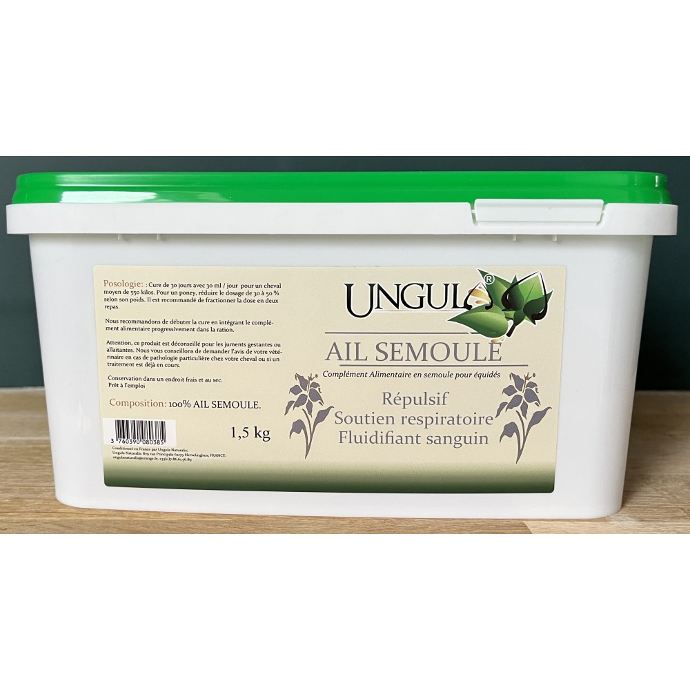 Ail : Soutien du système respiratoire ; Stimule la circulation sanguine (fluidifiant sanguin, élasticité des artères et formation des globules rouges) ; Prébiotique naturel qui soutient la flore intestinale ; Répulsif contre les insectes et contre les parasites intestinaux. / 1.5 kilos. 30 ml par jour pour 550 kilos