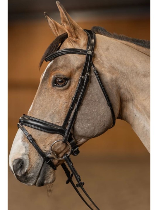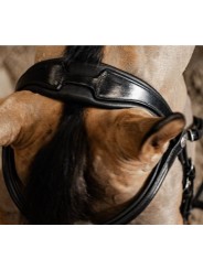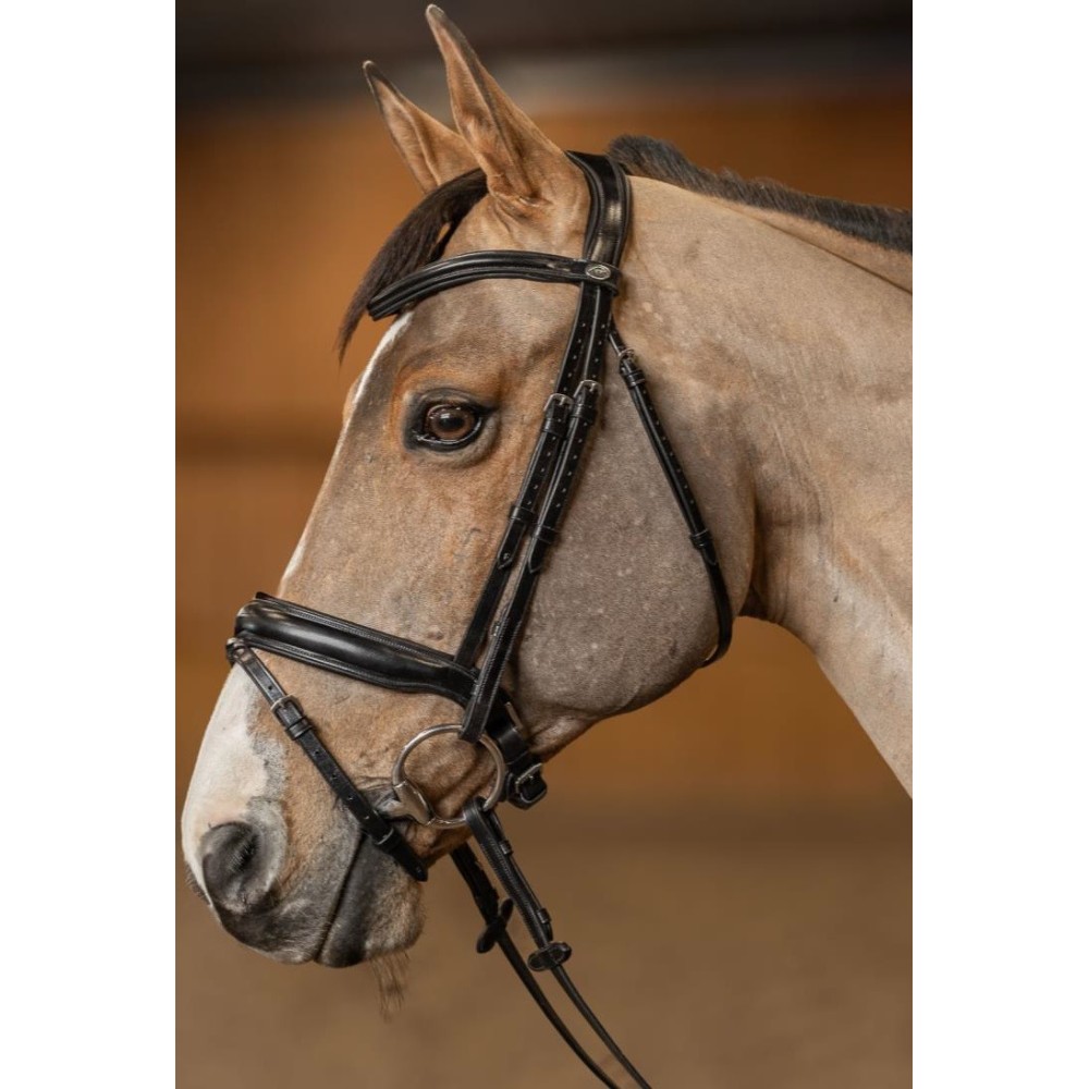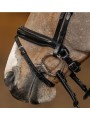 HFI Pro Line, une gamme conçue dans un cuir italien de qualité supérieure Large têtière anatomique et confortable, rembourrée et doublée de cuir souple / Frontal anatomique rembourrés et doublé de cuir souple / Large muserolle pull-back (4 cm), rembourrée et doublée de cuir souple / Surpiqûres ton sur ton / Boucles carrées / Rênes Hunter 1/2