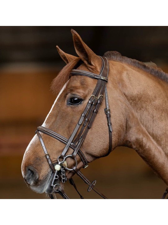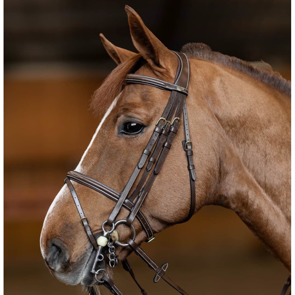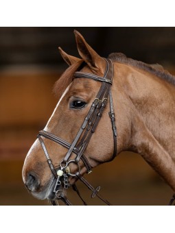 Bride de jumping / Large têtière anatomique rembourrée et doublée de cuir souple / Muserolle combinée, doublée de cuir souple et convertible en muserolle française / Frontal doublé de cuir souple / Surpiqûres ton sur ton / Vendue sans rênes