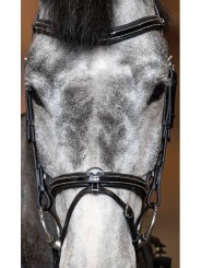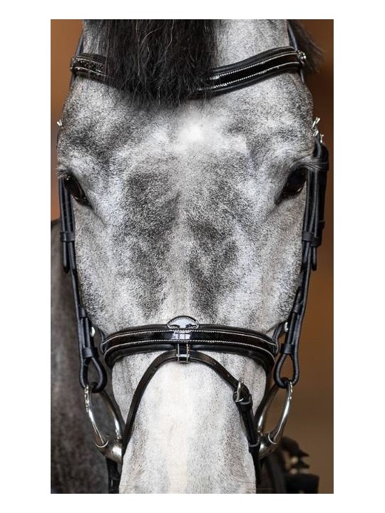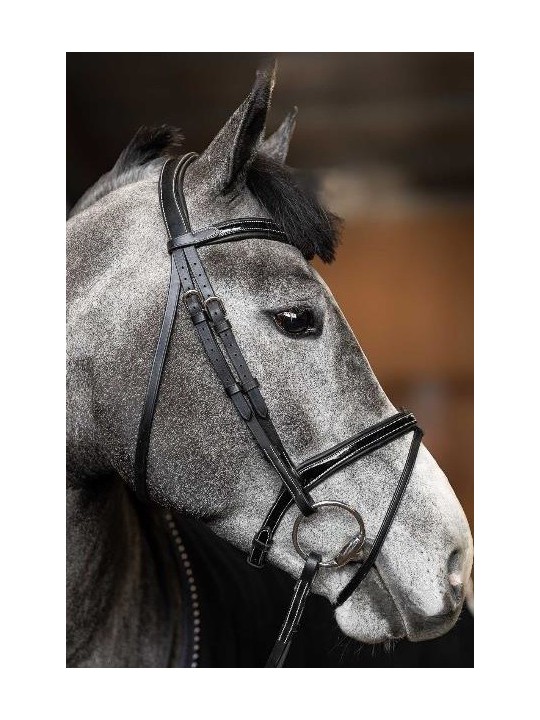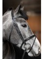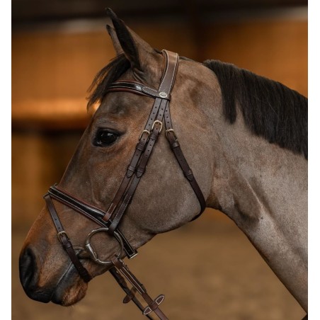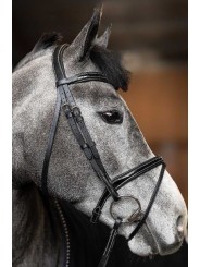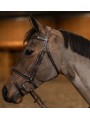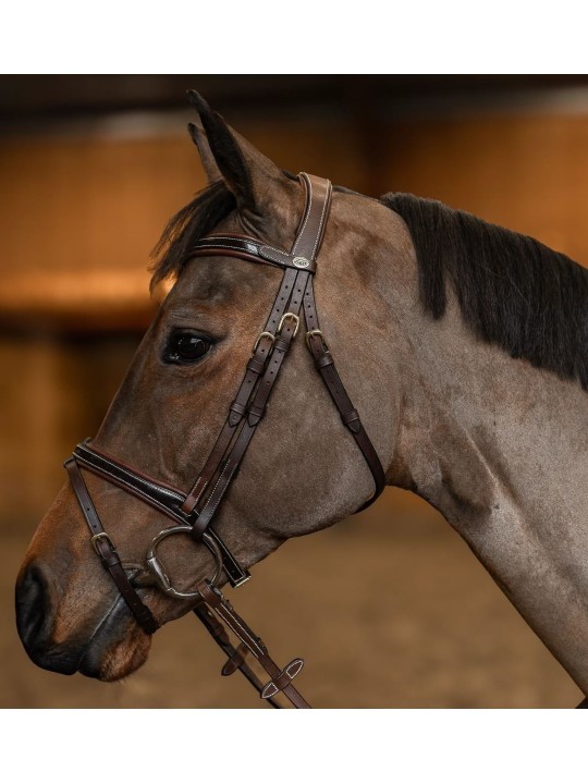 Têtière anatomique rembourrée et doublée de cuir souple / Frontal anatomique doublé d'un large rembourrage en cuir souple / Muserolle combinée convertible en muserolle française, laquée et doublée d'un large rembourrage en cuir souple / Surpiqûres crème / Rênes 5/8 en caoutchouc souple