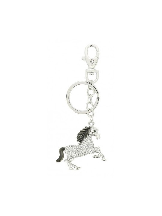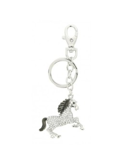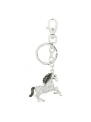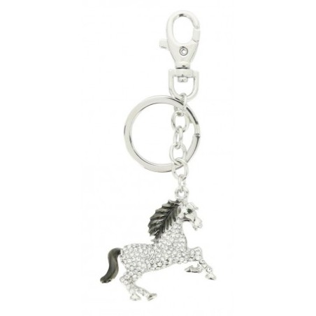 Porte-clés en forme de cheval galopant, orné de cristaux de verre.