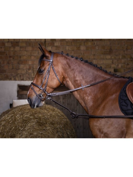 - Pratique : S'attache de chaque coté du mors et selon le besoin, sur les cotés ou entre les antérieurs.