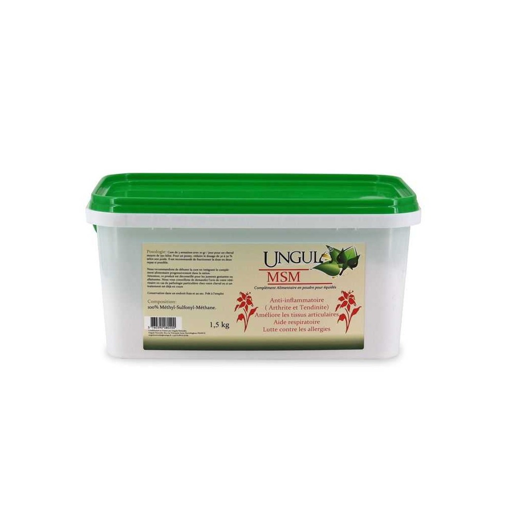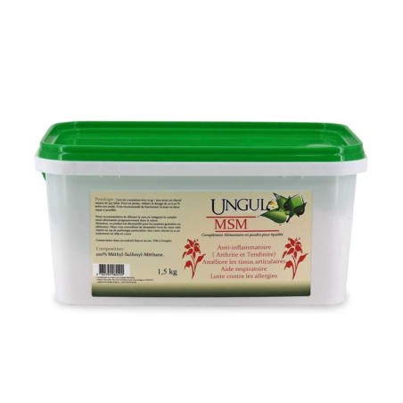 Le souffre présent dans le MSM aide à l’entretien et à la réparation des tissus conjonctifs (tissu jonction qui soutient les autres tissus du corps - articulations, tendons, muscles, poumons, sabots)