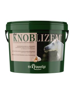 - Knoblizem®, le complément alimentaire apprécié pour les chevaux au pâturage assaillis par les insectes est une association réussie d’ail de qualité, d’herbes comme le romarin, la menthe poivrée, la coriandre, ainsi que des vitamines du complexe B. Knoblizem® met à disposition du cheval une source d’ail équilibrée mais pas trop piquante. Les germes de blé et les graines de lin fournissent de la vitamine E naturelle, des enzymes digestives et des acides gras précieux essentiels.