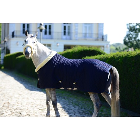 - La couverture de présentation est fabriquée en polyester haute ténacité 600D avec un surpiquage en diamant à la fois élégant et intemporel. Cela rend la couverture incroyablement difficile à déchirer et évite que les copeaux ne collent à la couverture. Pour éviter toute pression sur l'épaule et le garrot, le col de la couverture Show Rug est fabriqué à partir de notre populaire peau de mouton artificielle. Outre son aspect élégant, la peau de mouton artificielle est également beaucoup plus confortable. Par exemple, lorsque le cheval mange, la couverture n’appuiera pas sur la poitrine. La couverture est remplie de 160 g de fibres de rembourrage, qui ont les mêmes performances que le duvet mais n'absorbent pas les odeurs. Pour éviter les marques de frottement, la couverture est doublée de notre peau de lapin artificielle. Ce tissu est extrêmement doux et crée un effet brillant sur le pelage du cheval. En plus de cela, la peau de lapin artificielle crée de minuscules poches d'air. Ces poches emprisonnent et retiennent la chaleur corporelle du cheval, créant ainsi une couche isolante supplémentaire. La combinaison de ces matériaux crée une couverture très respirante avec un rapport chaleur/poids élevé.