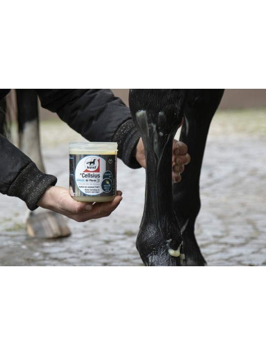 - Conserve l'effet de refroidissement obtenu par un arrosage rapide des jambes du cheval.
